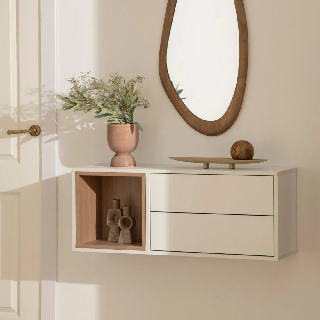 Transforma la entrada de tu hogar con el mueble recibidor flotante Ana. Cuenta con dos cajones que permiten almacenar las llaves, el correo u otros objetos esenciales que necesites tener a mano al entrar o salir de casa. Además, cuenta con un hueco en melamina color natural, que contrasta armoniosamente con el blanco, brindando un toque cálido y natural al espacio. Mueble ya viene 100% armado